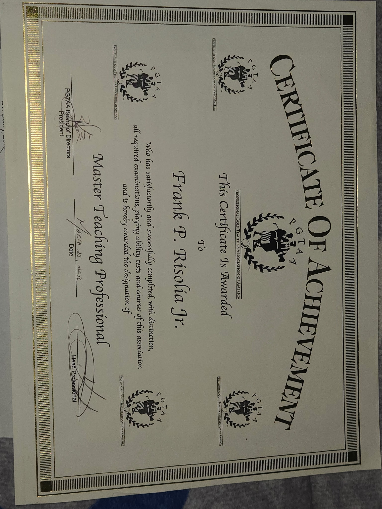 Frank Risolia is a PGTAA Class A Master Teaching Professional with 39 years of teaching experience. A graduate of the PGTAA / PGA program at La Quinta, California, Frank holds the rare distinction of being a credentialed PGA Locker / Range Coach — one of the most sought-after credentials a teaching professional can earn.