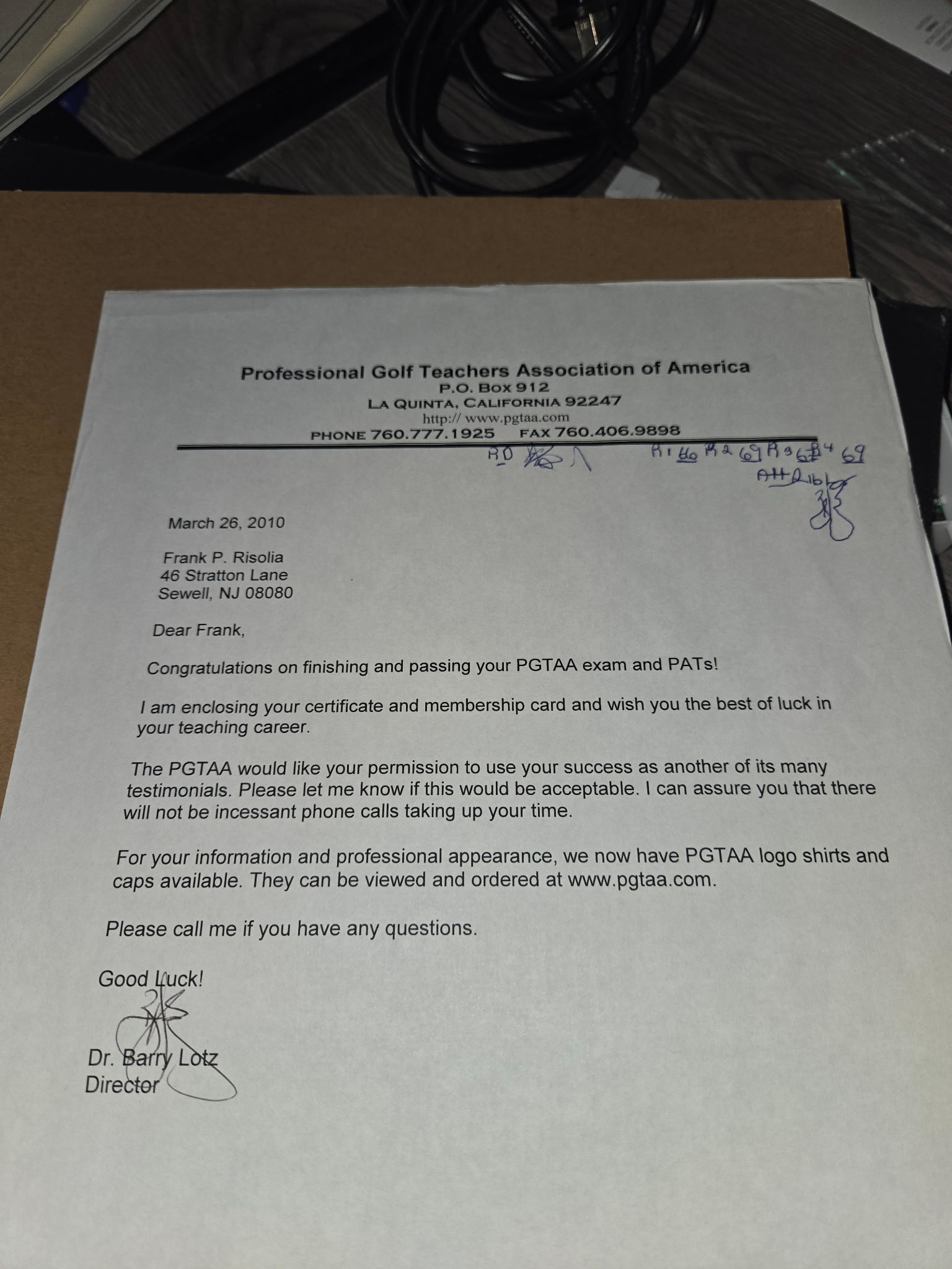 Tap to enlargeLetter from Dr. Barry Lotz, Director, Professional Golf Teachers Association of America